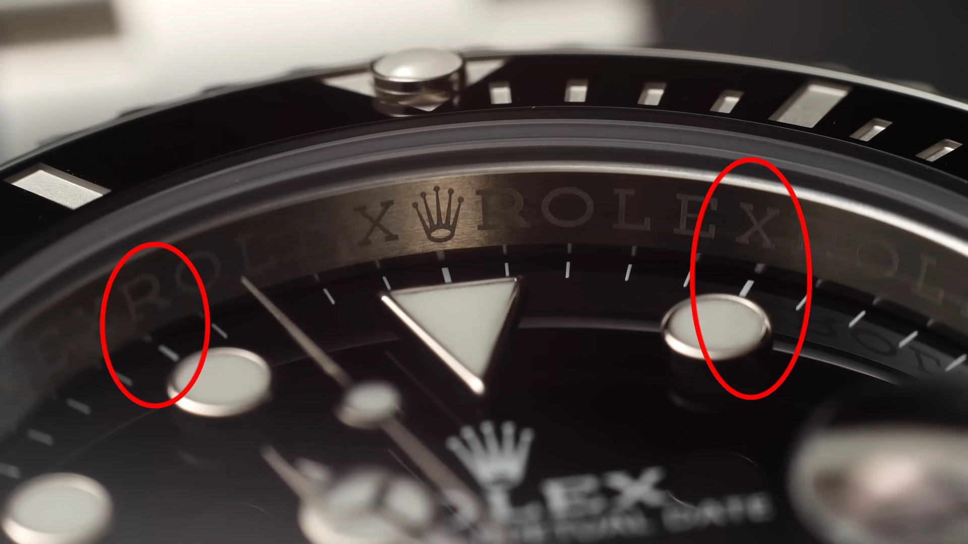 Genuine Rolex watches have the word "ROLEX" laser-etched with microscopic accuracy: the letters are sharp, uniformly spaced, and perfectly aligned. -