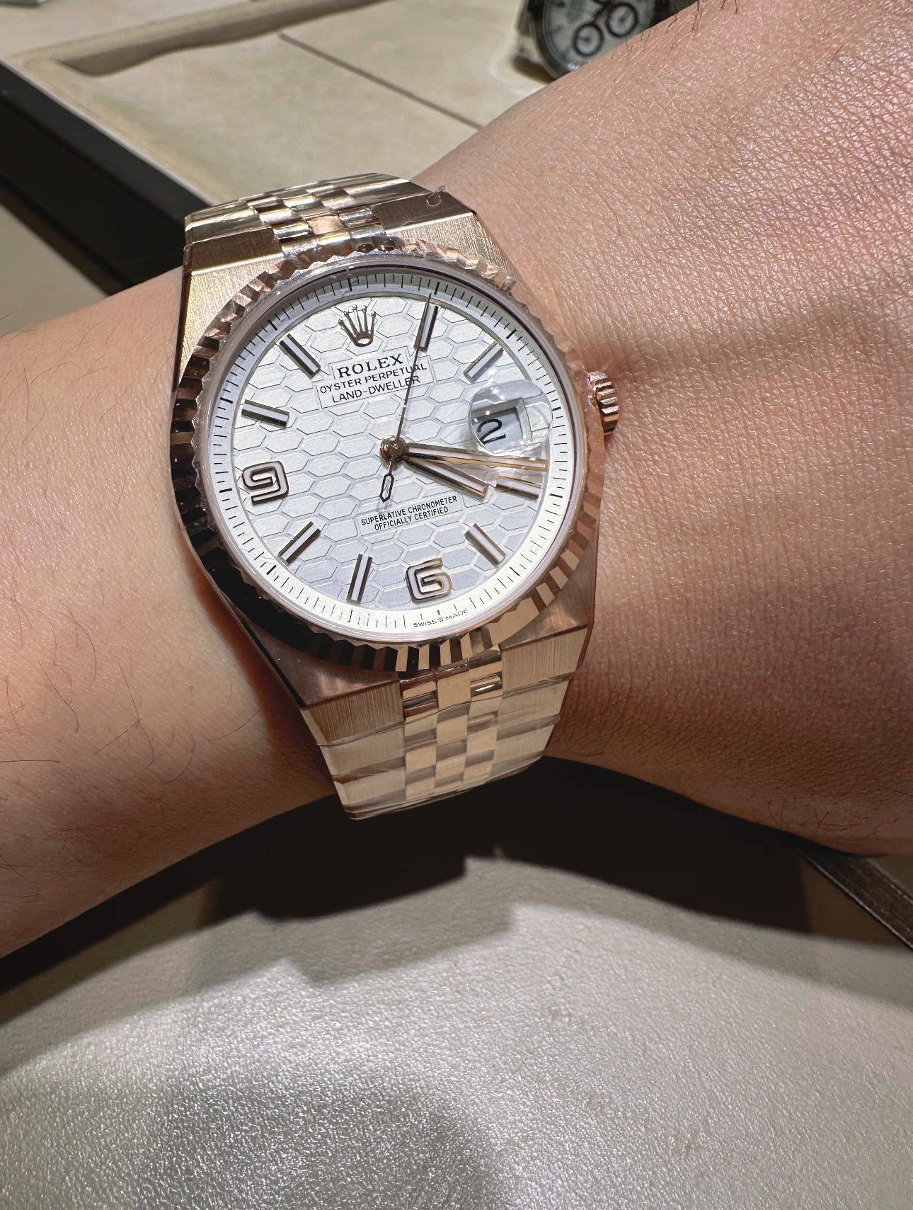 O Land-Dweller em ouro rosé é muito elegante e tem uma ótima presença no pulso. O acabamento é bom e o relógio parece sólido. Minha única pequena reclamação é que a pulseira poderia ser um pouco mais flexível — ela fica um pouco apertada no começo. Mas, no geral, estou satisfeito com a compra e recomendaria.