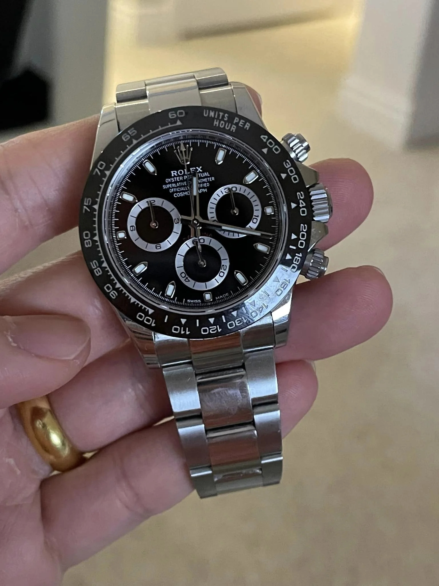 | BEZEL | – Fixed (does not move). Black Monobloc Cerachrom bezel in ceramic with moulded tachymetric scale |